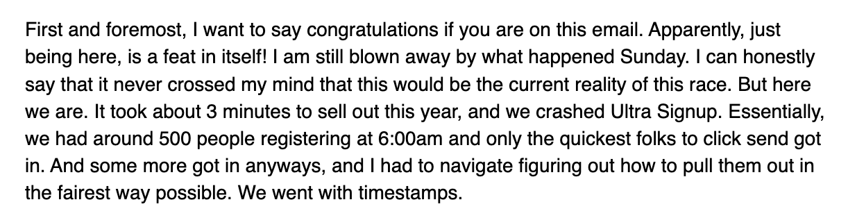 The irony? The friend who originally told me about this race and hyped it up missed the cutoff by seconds and is now stuck on the waitlist. This adds to our history of missed connections: